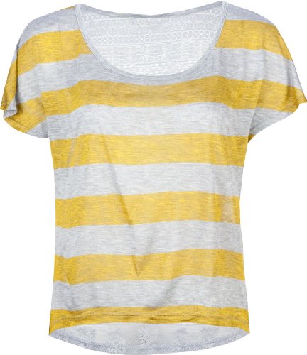 Full Tilt knit top. Allover horizontal stripes on front with allover slub effect. Sheer. Open knit crochet back panel. Short dolman cap sleeves. Scoop neck. 50% rayon/46% nylon/4% spandex. Machine wash. Imported.